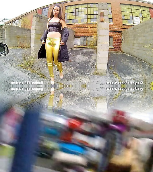 Diminutive street escort in shining pants deep-throats off stranger