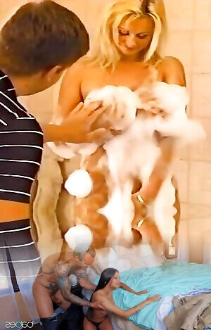 An Alluring Blonde Hot Babe Gets Shafted in A Threesome While Taking a Bath