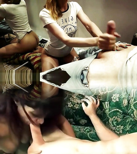 Two brunette girls sharing a long cock on the couch