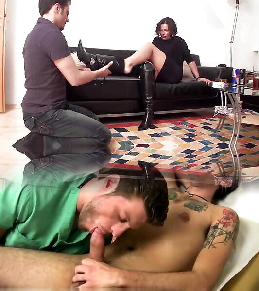 Feet in leather boots to be smelled