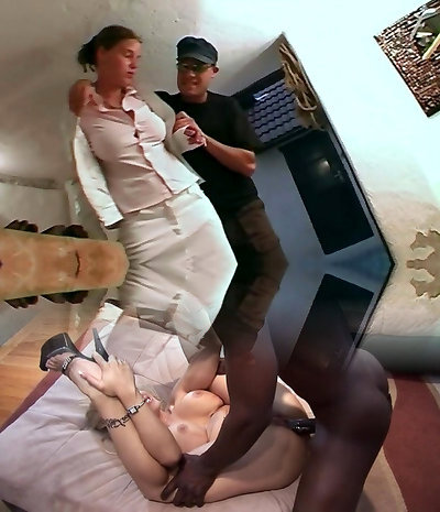 Insatiable and skinny white female poked with a big brown cock