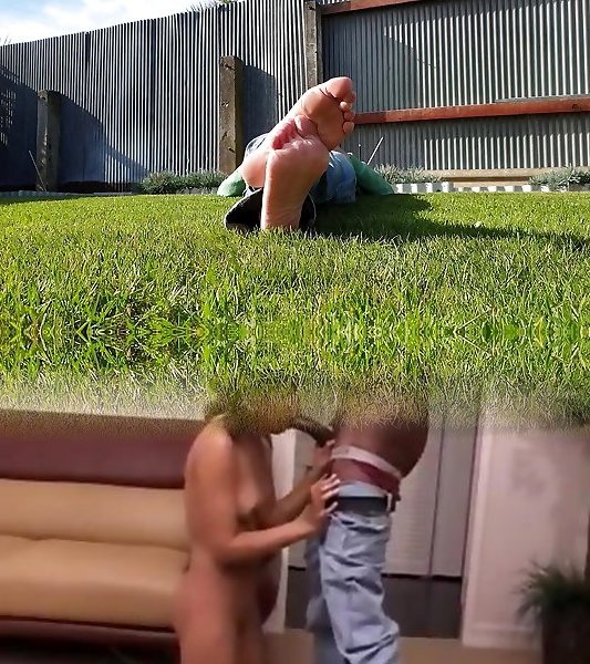 बिछाने के बाहर घास पर प्रदर्शन बंद तलवों पैर की अंगुली डीप थ्रोटिंग