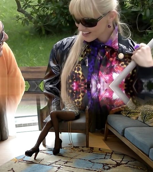 Towheaded in pvc mini micro-skirt inhale a happy dude outdor