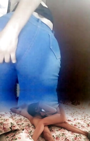 Blasted bi-atch wet jeans heels pouncing on a wood and afterwards getting hammered doggie-style