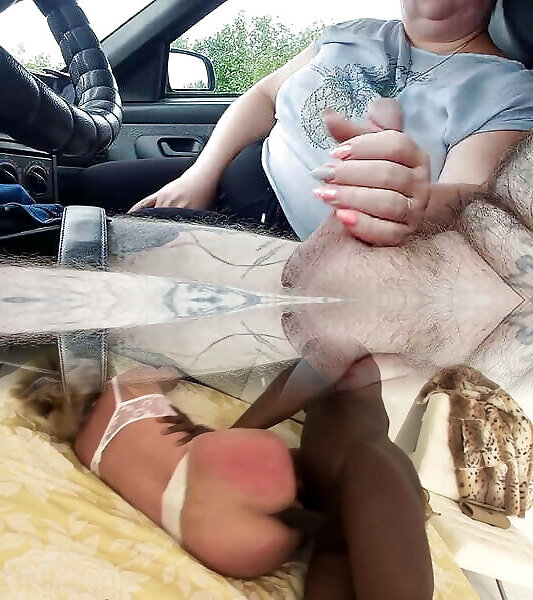 the bitch jerks off my dick in the car in the parking lot